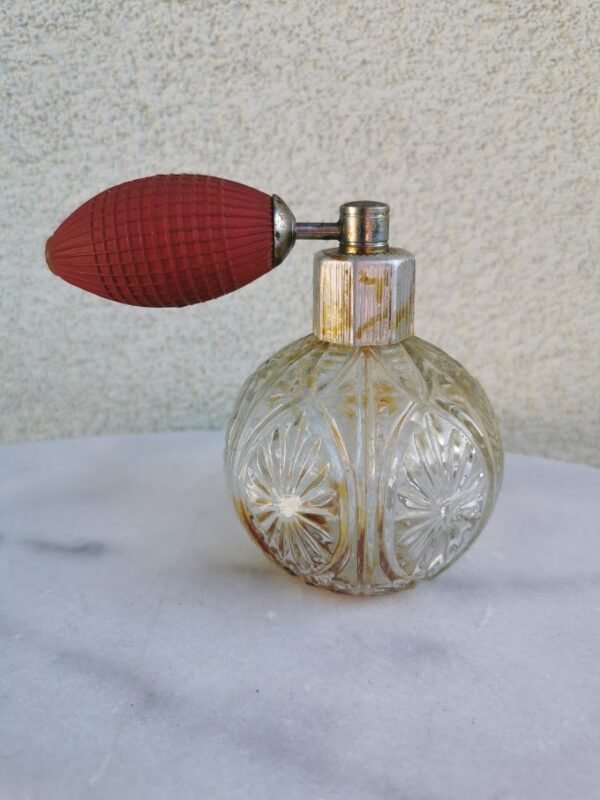 Butelis kvepalams, tualetiniam vandeniui antikvarinis, tarpukario Kaunas. Aukštis 17 cm. Kaina 26