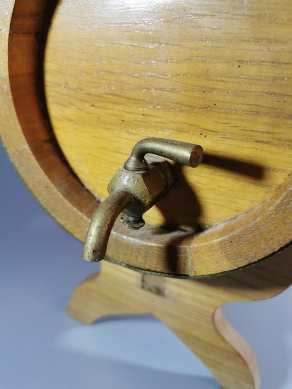 Bačkutė ąžuolinė su stovu ir metaliniu veikiančiu čiaupu. Tinkama naudoti pagal paskirtį. Bačkutės ilgis 17, skersmuo 12 cm. Aukštis su stovu 21 cm. Kaina 43