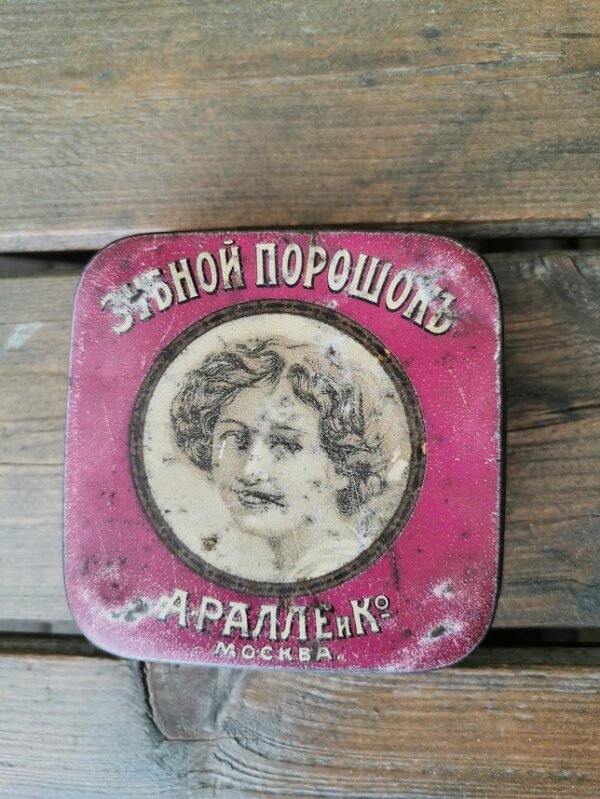Dėžutė dantų valymo miltelių Carinės Rusijos laikų. Maskva. Dydis: 4 x 9 x 9 cm. Kaina 38