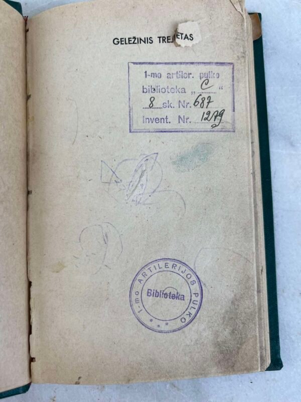 Knyga Geležinis trejetas. J. Dovydaitis. 1937 m. Spaudas: 1-Artilerijos Pulko Biblioteka. Kieti viršeliai. Kaina 38