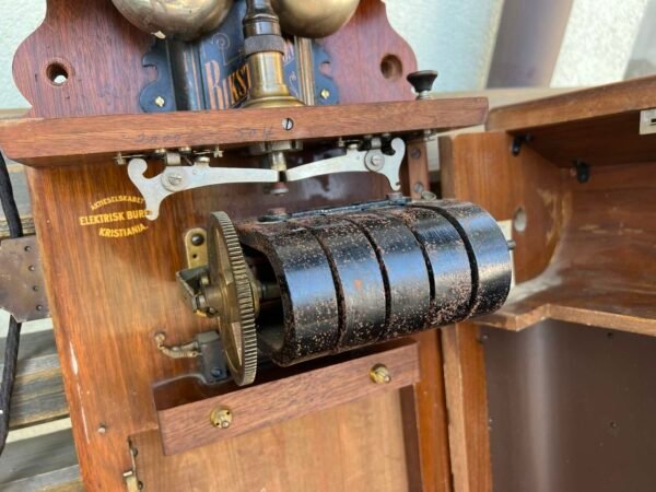 Telefonas antikvarinis, sieninis, 1908 m. Aukštis 74, plotis 24 cm. Matosi gamintojo etiketė. Kaina 683