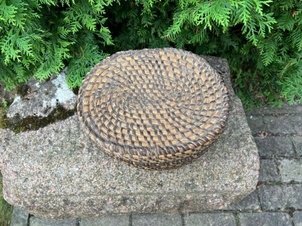 Pintas indas su dangčiu antikvarinis, liaudiškas, karbija, pinta bamblė. Dydis: 20 x 24 x 30 cm. Kaina 67
