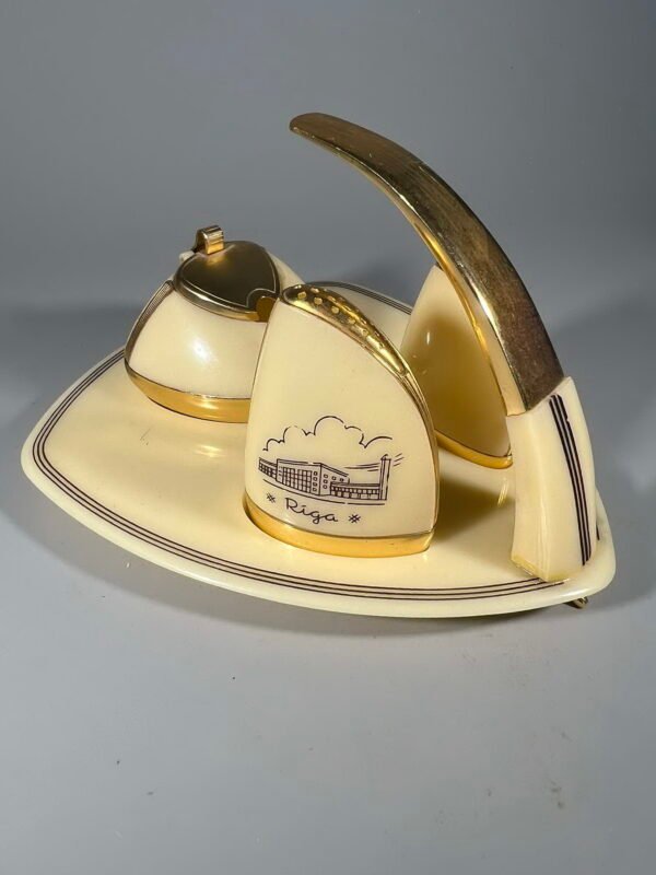 Indas metalinis, su rankenomis ir papuošimais. Ilgis be rankenų 18, plotis 9, aukštis 8 cm. Kaina 28