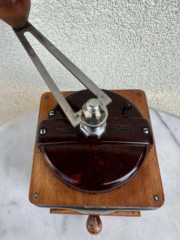 Kartu su Peugeot kavos malūnu, tai reprezentatyvus produktas iš Prancūzijos, o pagrindinis korpusas pagamintas iš storo liejimo aliuminio. Pagamintas apie 1950 m. Pagrindinio korpuso svoris yra apie 2,5 kg. Palyginti su mediniu malūnu, stabilumo pojūtis malant pupeles labai skiriasi. Masyvi medinė rankena bėgant metams įgavo tamsią, pasenusią spalvą. Jis yra didelis, todėl juo labai lengva naudotis. Sureguliuokite kavos malimo rupumo, šlifavimo lygį veržlės žiedu po rankena. Atsidarys priekinė dangčio pusė, todėl pupeles įdėkite iš čia. Baigę malti pupeles, išimkite jas ir mėgaukitės skania kava
