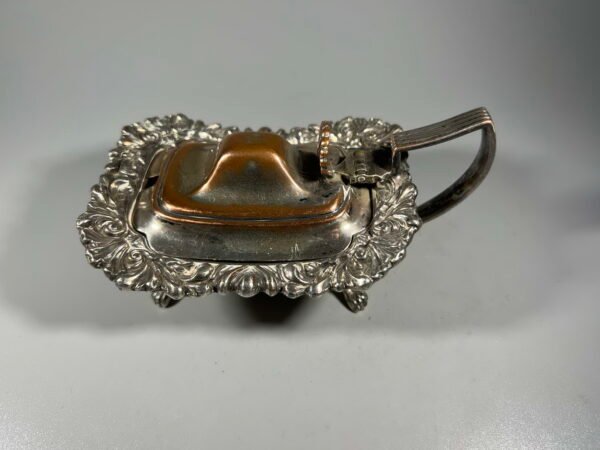 Indas sviestui, ikrams ovalo formos, antikvarinis, su grotelėmis, sidabruotas. London, Scheffield. Ilgis 21, plotis 14, aukštis 12 cm. Kaina 88