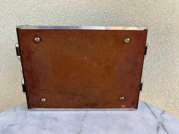 Padėklas Art Deco stiliaus su veidrodžiu, prancūziškas, antikvarinis 1930 m. Veidrodis, medis, aliuminis. Plotis 23, ilgis su rankenomis 35, be 31 cm. Kaina 73