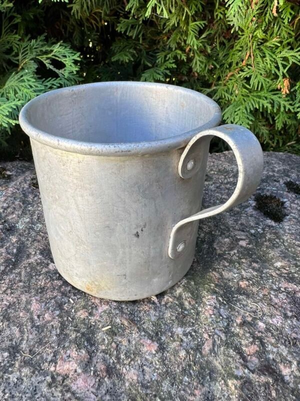 Puodelis aliuminis sovietinis, tarybinių laikų. Kauno gamykla PIRMŪNAS. Aukštis 9,5 cm. Skersmuo 9,5 cm. Kaina 17