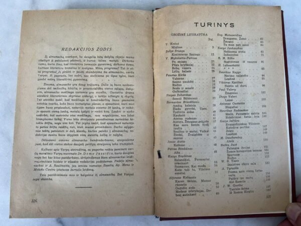 Knyga Varpai. Literatūros almanachas. 1943 m. 328 psl. Leidykla – Šiaulių meno ir mokslo centras. Kieti viršeliai. Kaina 18