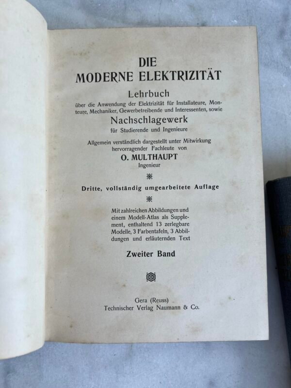 Knygos Multhaupt – Die moderne Elektrizität. Šiuolaikinė elektra. 2 tomai. Vok. k. 1912 m. Po 1330 psl. Kaina 68 už abi