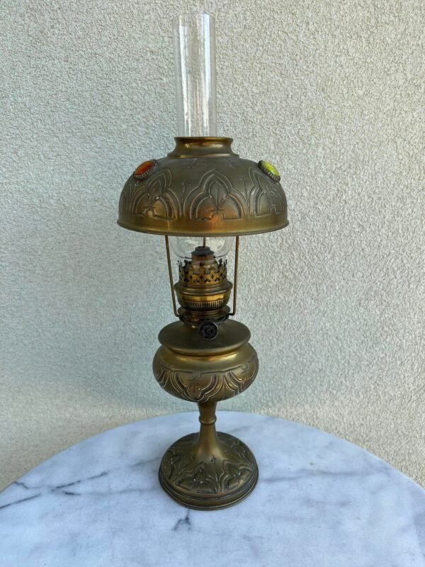 Lempa žibalinė Paryžietė antikvarinė. Prancūzija. Aukštis 42, gaubto skersmuo 12 cm. Įskilęs stiklo viršus. Kaina 48
