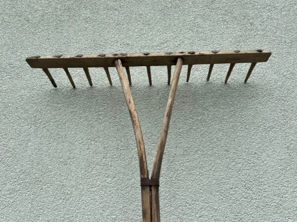 Grėblys medinis, antikvarinis. Ilgis 215 cm. Plotis 64 cm. Kaina 48