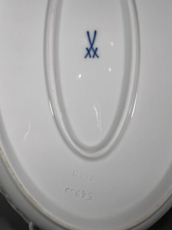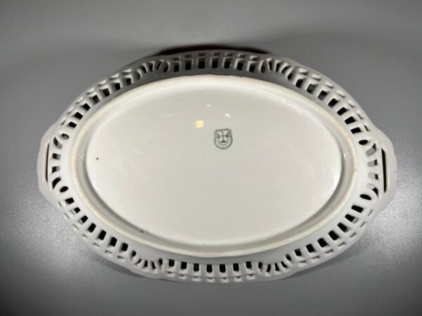 Lėkštė MEISSEN porcelianinė, ažūriniais kraštais, pintomis rankenomis. Meiseno karališkosios porceliano manufaktūros. Meisenas, Vokietija. Aukštis 6, plotis 18, ilgis 26 cm. Kaina 93
