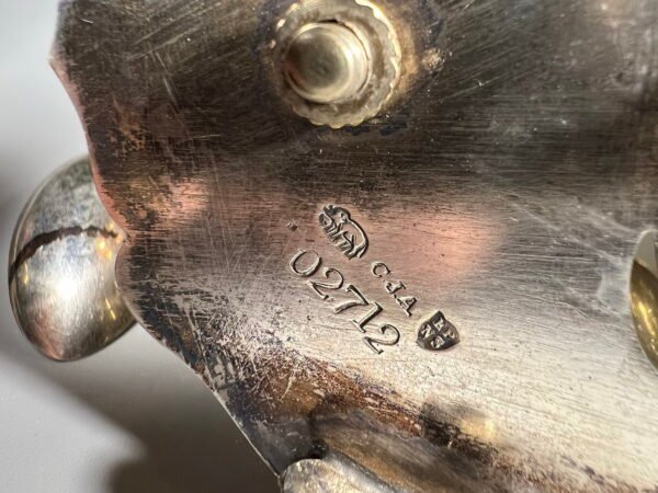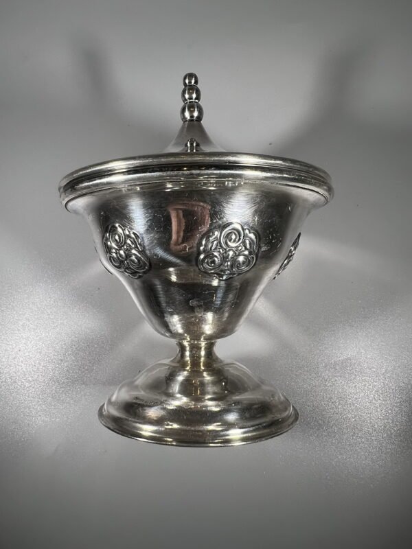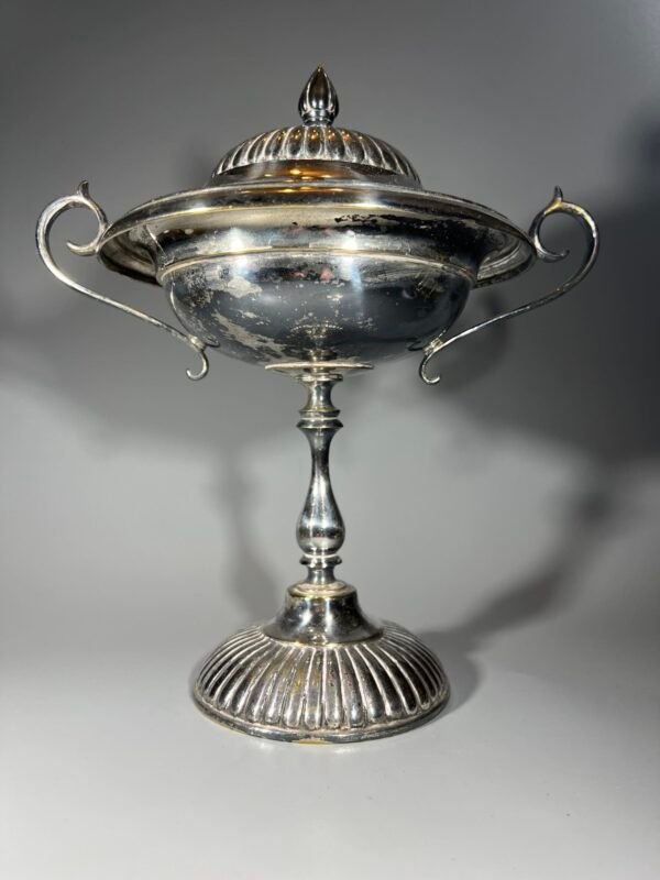 Cukrinė, indas ant kojelės, figūrinėmis rankenėlėmis, sidabruota, antikvarinė. Aukštis 28 cm. Kaina 58