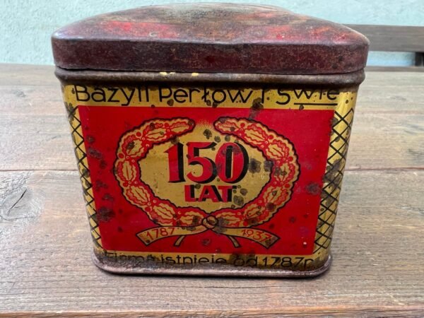 Skardinė arbatai antikvarinė, Wassily Perloff et Fils, Jubiliejinė, 150 metų, 1787-1937 m. Dydis: 9 x 9 x 14 cm. Kaina 28