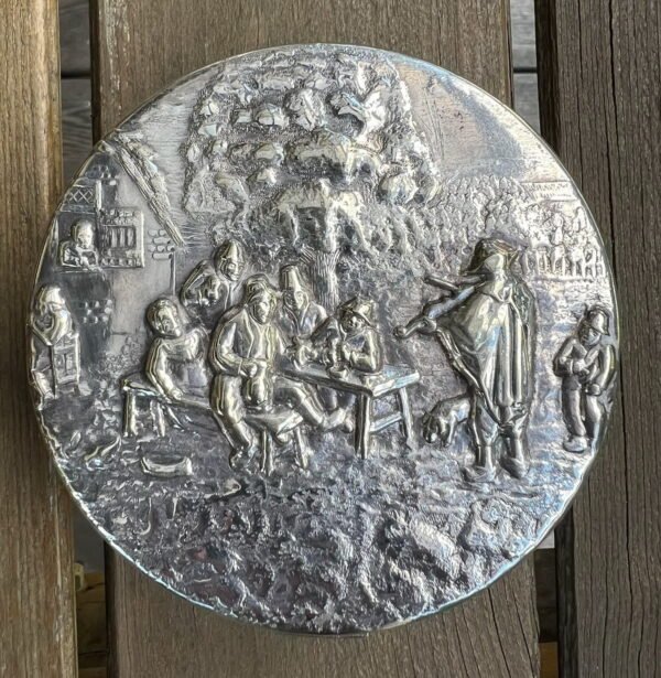 Skrynelė, dėžutė sidabruota antikvarinė Prima Alpacca Import. Aukštis 3,5, skersmuo 10 cm. Kaiina 26