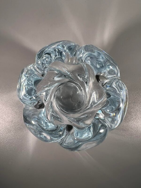 Vaza storo presuoto stiklo, Mid-century modern stiliaus. Autorinė. Gali būti ir žvakidė. Svoris 1200 g. Skersmuo 10, aukštis 11 cm. Kaina 22