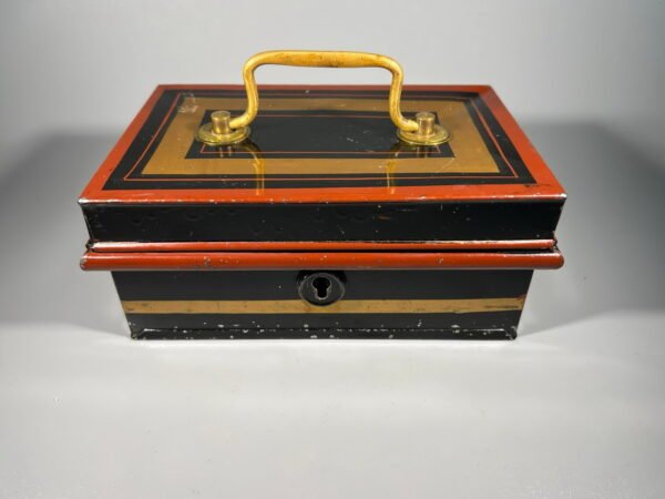 Dėžutė pinigams, taupyklė, skardinė. antikvarinė, rakinama, su rakteliu, angliška. Dydis: 5 x 7 x 11 cm. Kaina 21