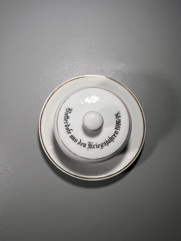 Sviestinė antikvarinė Butterdose aus den Kriegsjahren 1916/18. Sviestinė iš 1916–1918 metų karo metų, porcelianinė. Vokietija, I PK. Aukštis 6, skersmuo 9 cm. Kaina 78