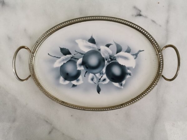 Lėkštė porcelianiė vaisiams, pyragaičiams, dviejų aukštų padėklas, antikvarinis. Aukštis su rankena 25, apatinės lėkštės skersmuo 24, viršutinės 18 cm. Kaina 32
