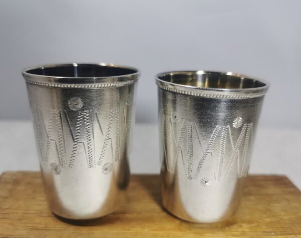Taurelės, stikliukai sidabrinės. 2 vnt. Praba 875. Svoris abiejų 57,4 gr. Aukštis 5,3 cm. pagrindo skersmuo 2,5, viršaus skersmuo 3,8 cm. Kaina po 77