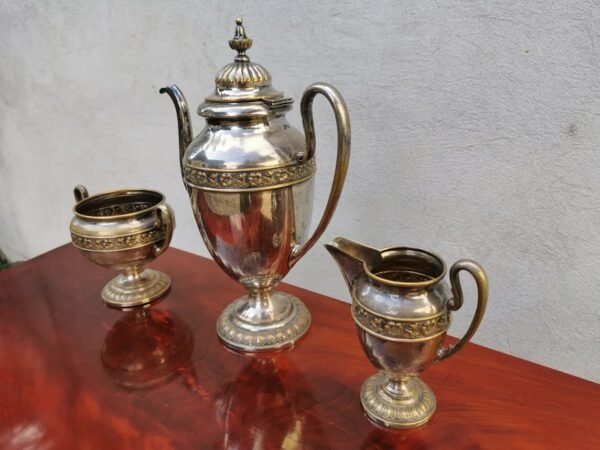 Komplektas antikvarinis, sidabruotas. Kavinukas, cukrinė, pienui/grietinėlei. Arbatinio/kavinuko aukštis 32 cm. Kaina 58
