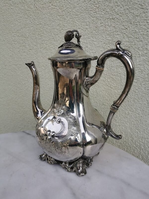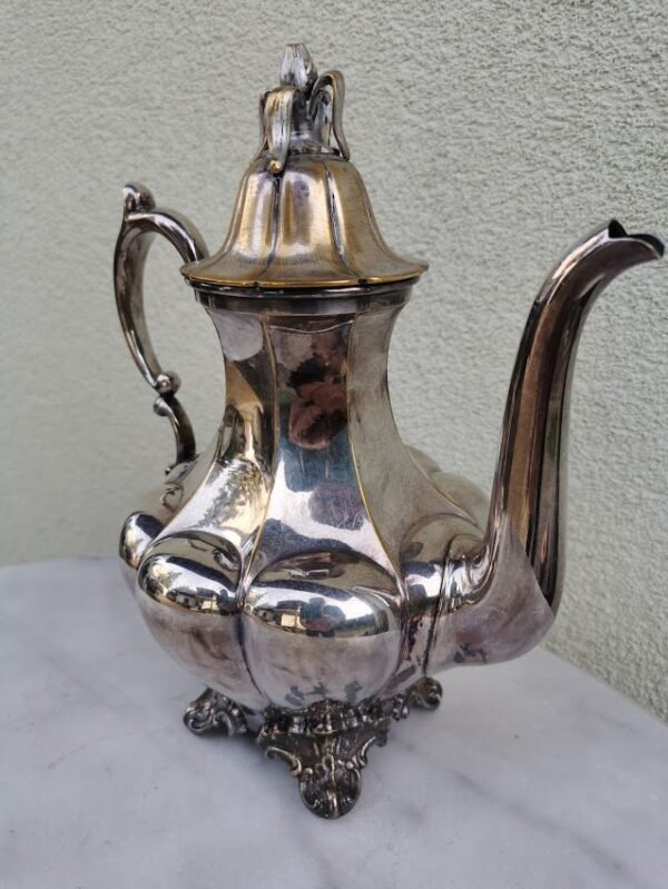 Arbatinis, kavinukas antikvarinis, sidabruotas, angliškas. Aukštis 17, ilgis 28, plotis 12 cm. Kaina 42