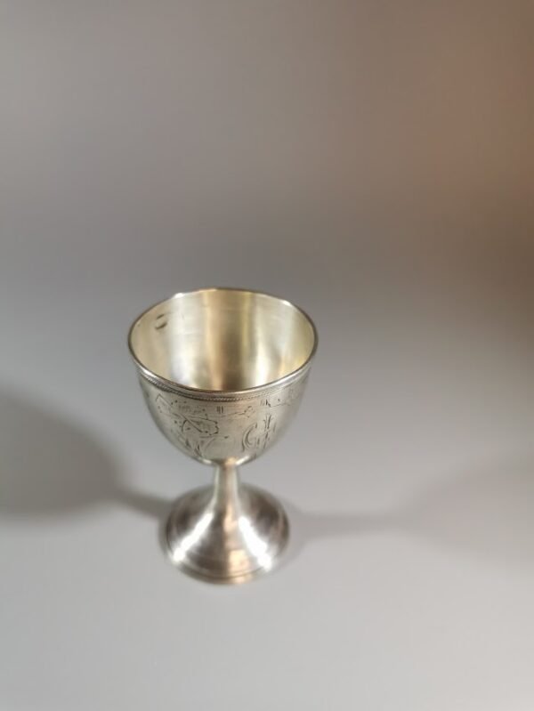 Taurelė, stikliukas ant kojelės sidabrinis. Praba 875. 1936 m. Svoris 20,5 gr. Aukštis 7 cm. pagrindo skersmuo 2,5, viršaus skersmuo 4 cm. gali būti ir kiaušinio dėklu. Kaina 68