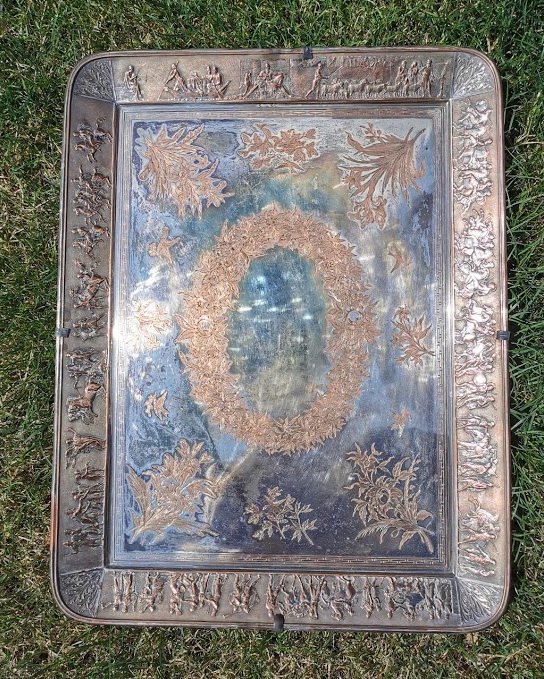 Padėklas varinis, sidabruotas, antikvarinis. Dydis: 40 x 50 cm. Orabuotas. Galima pakabinti ant sienos. Kaina 107