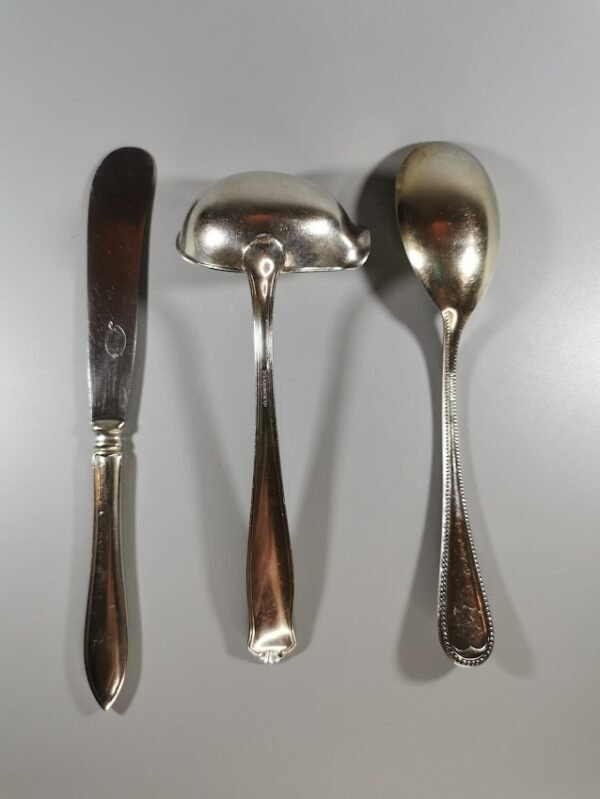 Stalo įrankiai sidabruoti, antikvariniai. 3 vnt. Peilio ilgis 20 cm. Kaina po 4 arba 8 už visus.