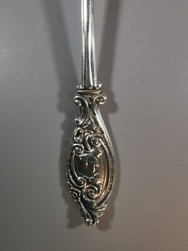 Šaukštelis sidabrinis, puoštas ornamentais, antikvarinis. Ilgis 15 cm. Svoris 20 g. Kaina 48
