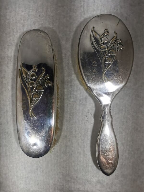 Šepečiai rūbų, antikvariniai, sidabruoti. PRIMA. Inicialai. G. E. 2 vnt. Augalinis-pakalnučių motyvas. Ilgis 18 ir 22 cm. Kaina 43 už abu.
