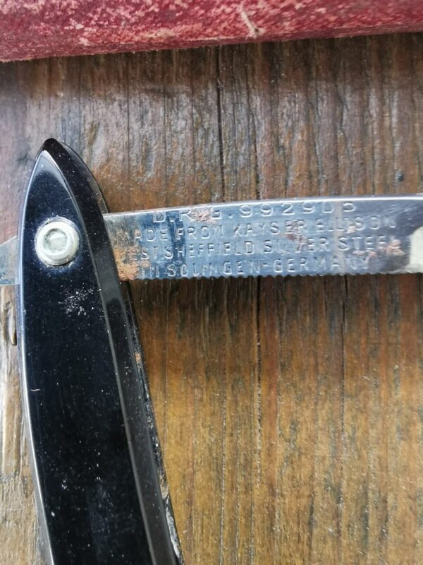Antikvarinis skustuvas MADE BY KAYSER ELLISON & CO’S BEST SHEFFIELD SILVER STEEL. Bartputzer 1927. Kaina 27