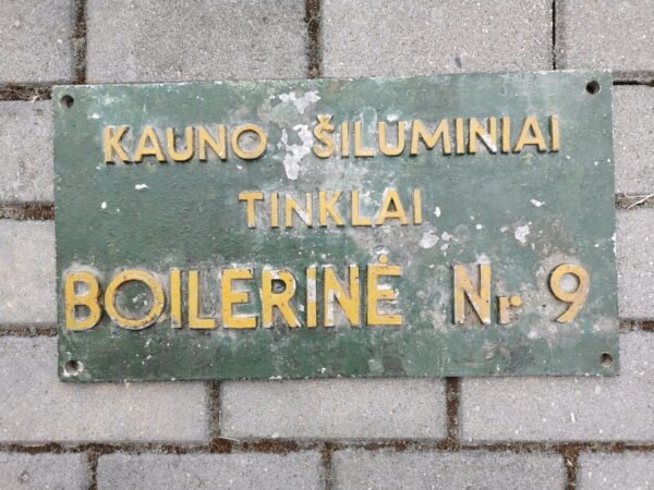 Lentelė. iškaba metalinė „Kauno Šiliminiai tinklai Boilerinė Nr. 9”. Dydis: 26 x 50 cm. Kaina 58