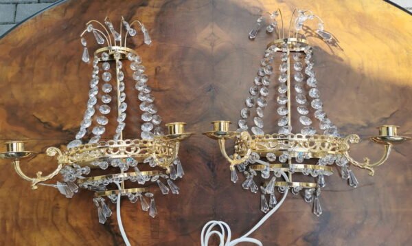 Šviestuvai sieniniai, bra, krištoliniai, vintažiniai. 2 vnt. Aukštis 35, plotis 30 cm. Kaina po 48