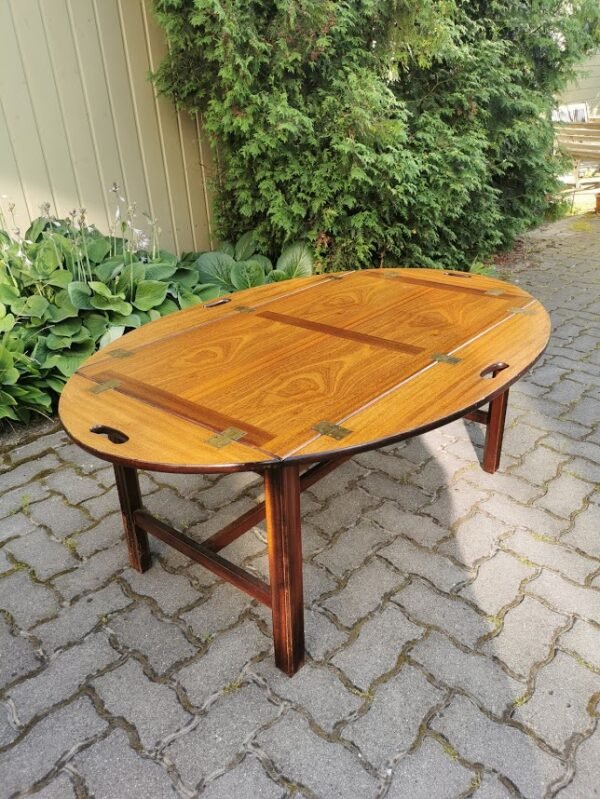 Stalas – padėklas nuimamu stalviršiu. Aukštis 53, dydis: 59 x 103 cm. Išskleisto: 90 x 135 cm. Kaina 97