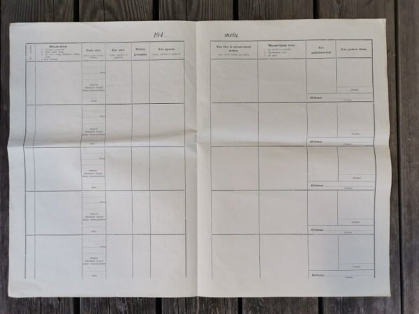Mirimų Metrikos Rymo-Katalikų parapijos. tuščias blankas. Tarpukario Lietuva. 194…m. Atversto dydis: 42 x 60 cm. Kaina 16