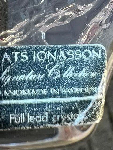 Cast crystal sculpture with sandblasted and painted motif. The sculpture is handmade in Sweden and signed. Design Mats Jonasson
